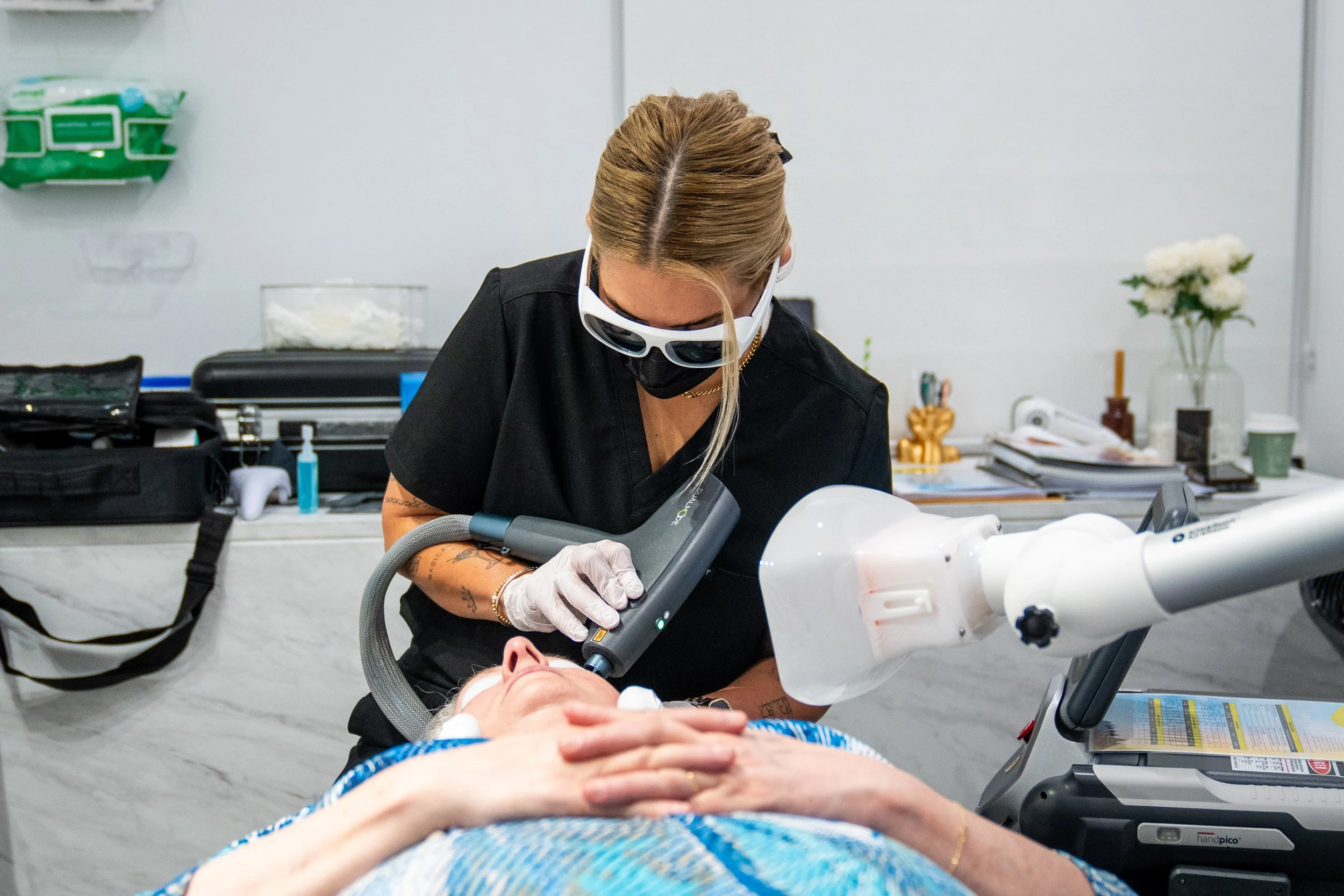 Laser and light-based technologies (including Etherea platform) used to address pigmentation, vascular concerns, texture, and skin quality.