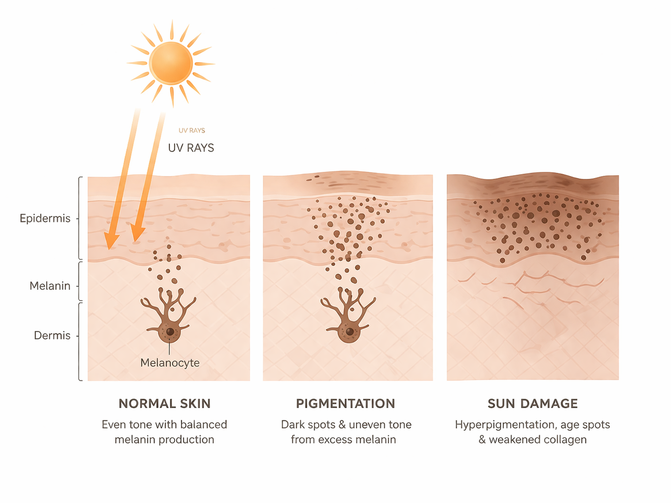 Assessment and management of uneven pigmentation, sun damage, and melasma.